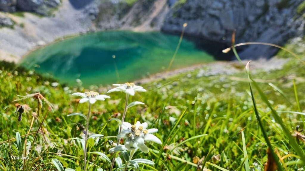 For many hikers, Lower Križ Lake is the most beautiful alpine lake in Slovenia. Surrounded by towering rock walls and dramatic peaks, the lake shines in deep blue colors. During July and August the meadows around the lake are often full of edelweiss, creating an unforgettable alpine atmosphere.