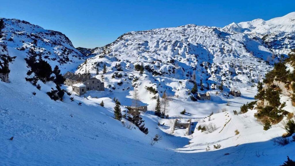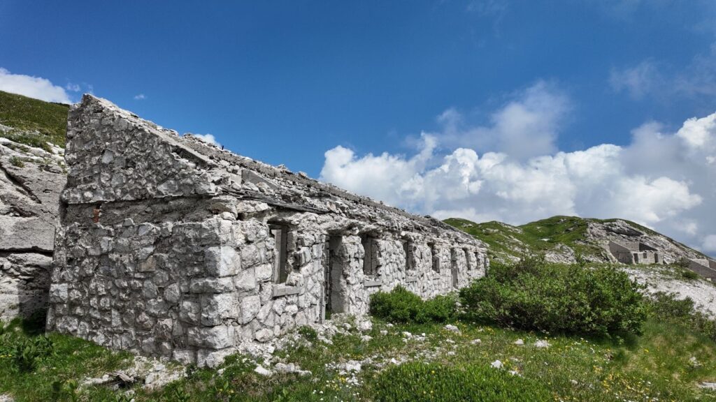 From Prehodci the trail continues toward za Lepočami, where you can see the remains of a former military barracks from the time of the Treaty of Rapallo. This was once the largest Italian military barracks in the Slovenian Alps, built to guard the border between the Kingdom of Italy and the Kingdom of Yugoslavia.