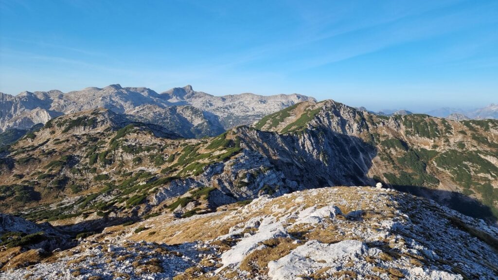Early the next morning, continue across the karst plateau of Mrzla Komna — the coldest recorded place in Slovenia, where temperatures dropped to −49°C in 2009 — and hike toward Lanževica (2003m).